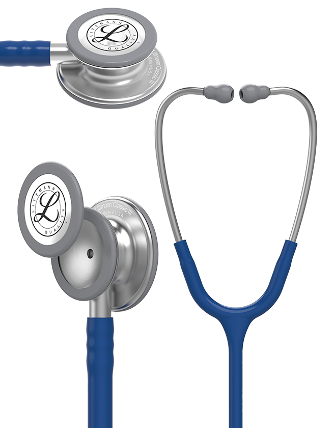The 3M™ Littmann® Classic III™ Stethoscope is the latest version of the stethoscope that helps millions of medical professionals achieve their best. The Classic III stethoscope offers high acoustic sensitivity for exceptional performance, plus a versatile two-sided chestpiece with tunable diaphragms. The Classic III stethoscope is used by students and medical professionals alike to identify, listen to, and study heart, lung, and other body sounds for physical assessment, patient monitoring, and diagnosis. Tunable diaphragm technology—a 3M invention—lets clinicians hear different frequency sounds by simply adjusting the pressure on the chestpiece. Hold the chestpiece with light pressure to hear low frequency sounds; press a little more to hear higher frequency sounds. This time-saving feature allows the healthcare provider to focus on the patient, while the non-chill diaphragm provides patient comfort. Headset tension is easily adjusted for head size and comfort by squeezing together or pulling apart the eartubes. Snap-tight, soft-sealing eartips conform to individual ears for an excellent acoustic seal and comfortable fit. Eartips snap firmly onto the ends of the eartubes and, for safety, require a significant effort to remove. Resilient next-generation tubing retains its shape and flexibility even after folding tightly into a pocket. It provides longer stethoscope life due to improved resistance to skin oils and alcohol, and is less likely to pick up stains. Next-generation tubing is not made with natural rubber latex, a benefit to sensitive medical professionals and their patients. And, to play its part in the protection of human health and the environment, the next-generation tubing does not contain phthalate plasticizers. The Classic III stethoscope is made in the USA for consistent quality. It comes complete with large and small soft-sealing eartips, non-chill bell sleeve, and instructions.