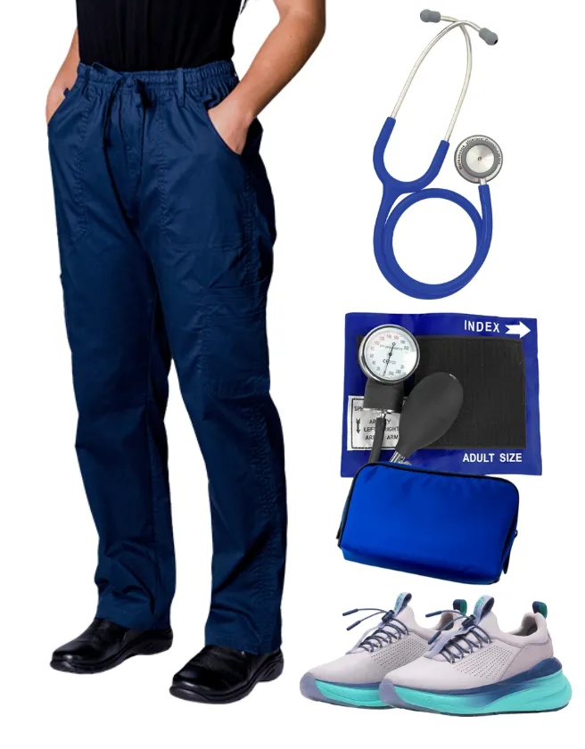 Bundle 18 - Sphygmo (Traditional), Dual Head Stethoscope, 9-Pocket Pant and Clove SuperCush Forte Grey/Aqua/Blue | Combo